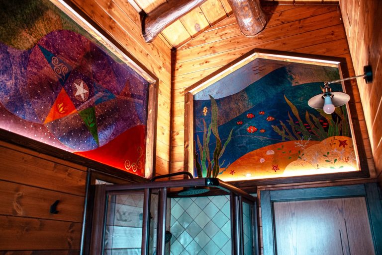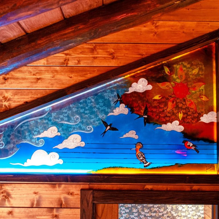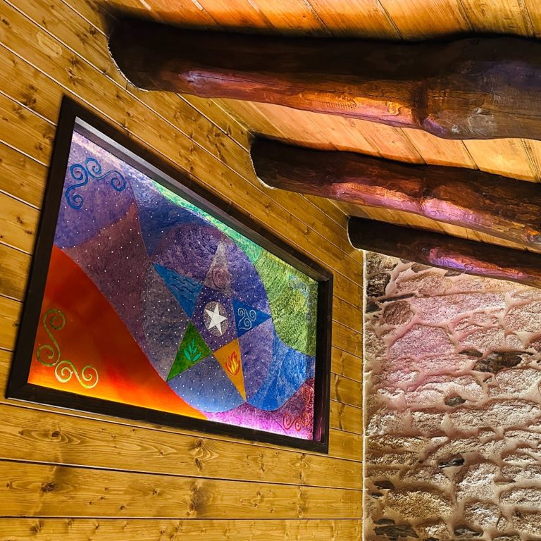 Las vidrieras, pintadas a mano, representan los cinco elementos de la naturaleza: tierra, agua, fuego, aire y éter. Hacen de la casa un espacio que nos acoge y nos conecta con nosotros mismos y con el mundo que nos rodea.